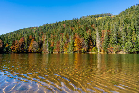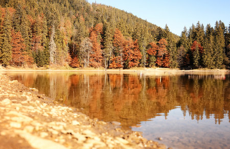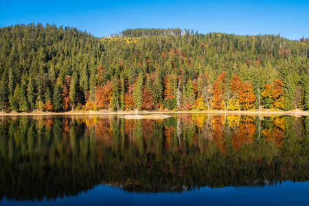 Beautiful calm Synevyr lake autumn landscape with red yellow brown trees, pines with cones on a sunny day, West Ukraine. Bright and vibrant landscape scene. Nature background