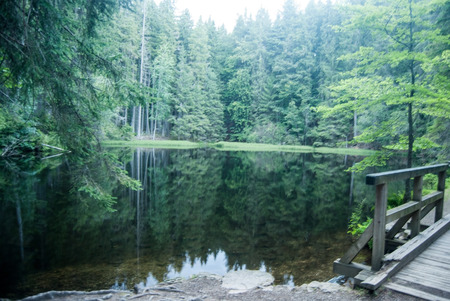 Evening Boubinske jezirko lake with forest around bellow Boubin hill in Sumava mountains