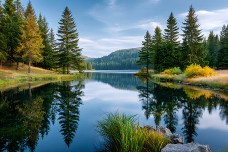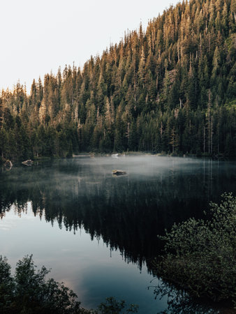 A serene landscape features a calm lake reflecting the surrounding forest and sky. Tall trees frame the water, with hints of mist adding depth. The composition showcases natural textures, colors, and the interplay of light. Suitable for various editorial and commercial applications promoting nature and environment.