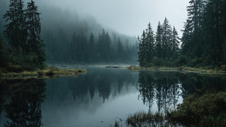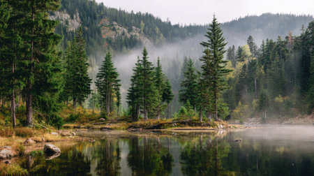 Experience the tranquil beauty of a calm lake reflecting tall pine trees and misty mountains. This serene setting captures the essence of nature.