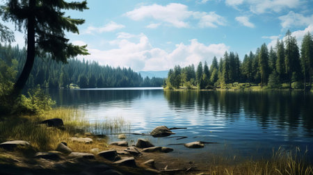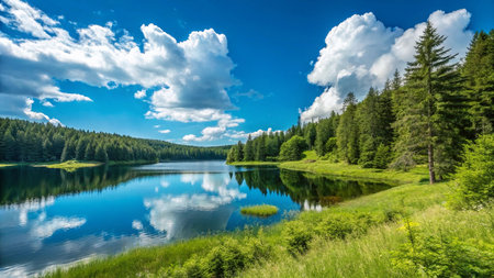 A serene landscape depicts a calm lake reflecting the surrounding trees and a clear sky. The image features a vibrant color palette, showcasing the natural beauty of the environment. Suitable for a variety of projects requiring peaceful visuals, editorial content, and commercial use.