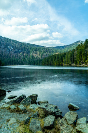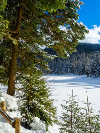 Winter landscape in the Bohemian Forest. Black lake, Sumava National park, Czech Republic.