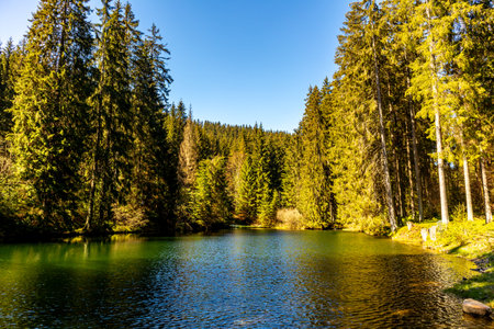 Lake on top of mountain, dark colored water and vibrant green grass, surrounded with trees, Crno jezero or Black lake is a popular hiking destination on Pohorje, Slovenia
