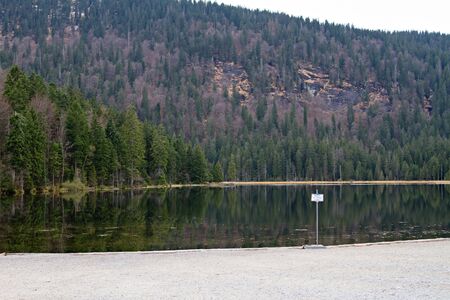 Mountain lake with coniferous forest in the background. Panorama