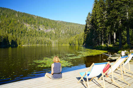 A caucasian woman sitting on the boardwalk of beautiful lake Großer Arbersee in the Bavarian Forest. Some deck chairs in front. Upper Palatinate, Bavaria, Germany.