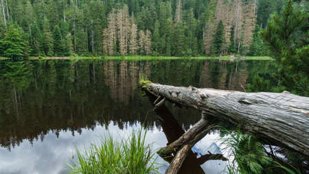 Wild lake in the Black Forest with tranquil water surface reflecting a fallen tree trunk, Black Forest, Germany