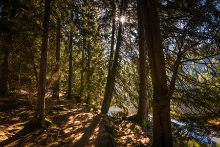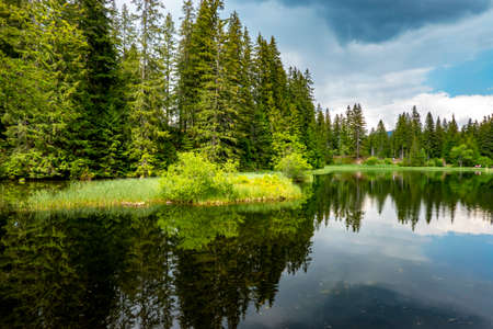 high altitude mountain lake among the forest. spruce trees on the shore. beautiful nature scenery on a sunny day.