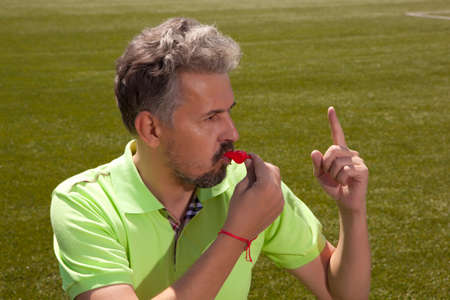 Angry football referee blowing a whistle and pointing with his hand