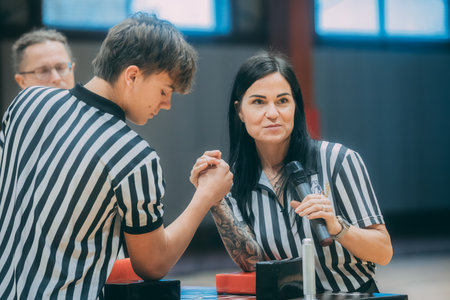 STOCKHOLM, SWEDEN - JANUARY 13, 2018: Profile view of a Swedish and Russian male arm wrestler and referrees in a match at the event Arm Battle of Sweden outside of Stockholm January 13, 2018.