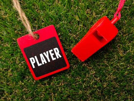 A dynamic scene capturing a football coach preparing for a training session, emphasizing the player's shoes and clipboard on the grass. Ideal for sports themes.