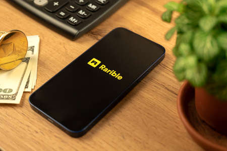 Kharkov, Ukraine - December 20, 2021: Rarible NFT marketplace open on mobile phone screen photo