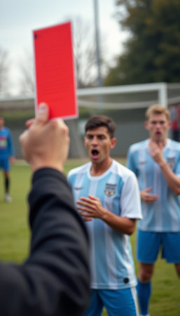 A referee holds up a red card, capturing the intense moment of a soccer player’s disbelief and frustration. The scene is charged with emotion, highlighting the tension of the game as teammates react to the unexpected decision.