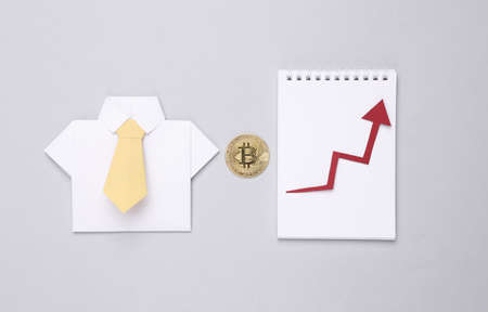 Notepad with growth arrow, bitcoin and orgami shirt on gray background. Business and finance, rising bitcoin prices concept