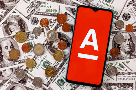 Kazan, Russia - Mar 27, 2022: Smartphone with Alfa Bank logo surrounded by variety of metal coins on background of dollar bills