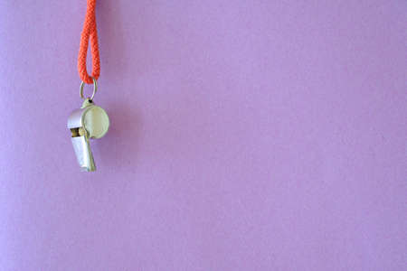 Women's soccer and championship concept.Whistle of soccer referee or trainer on purple background.
