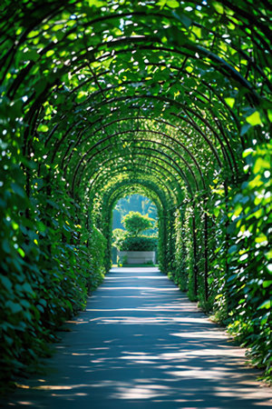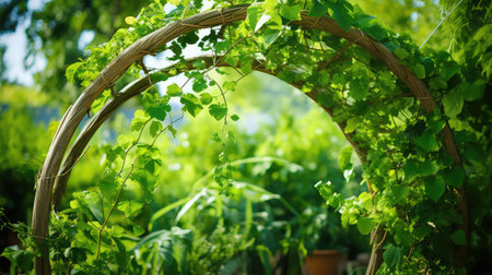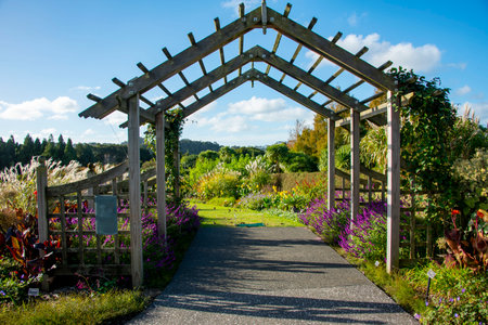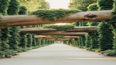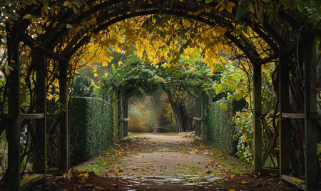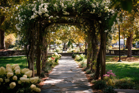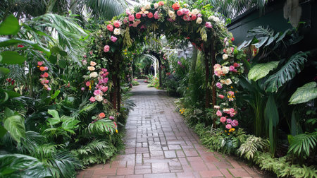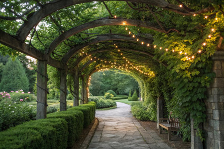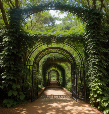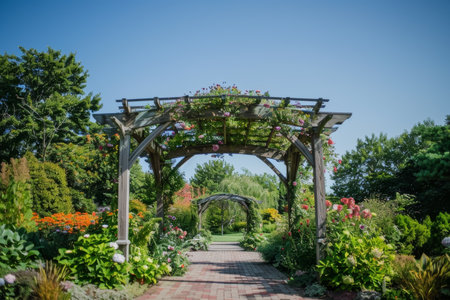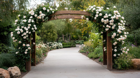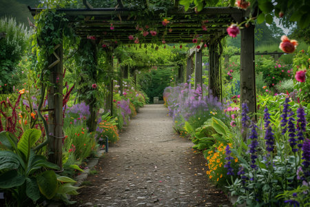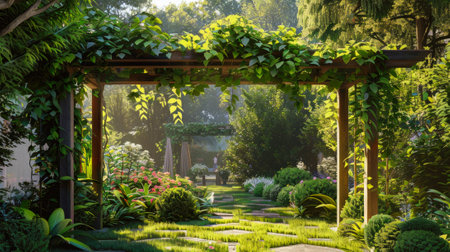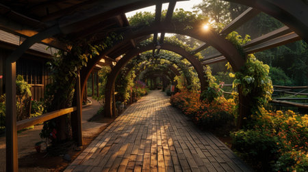 Serene garden pathway adorned with lush greenery and vibrant flowers, framed by elegant wooden arches. warm sunlight filters through, creating peaceful and inviting atmosphere