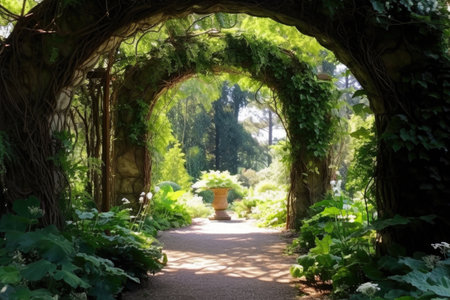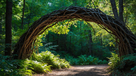 A serene pathway winds through a dense forest, featuring a stunning, naturally crafted wooden arch, surrounded by vibrant green plants and trees, offering a tranquil and magical atmosphere. AI generated image