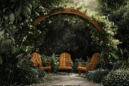 Enchanting wooden arch and chairs amidst lush greenery and blooming flowers in a tranquil garden