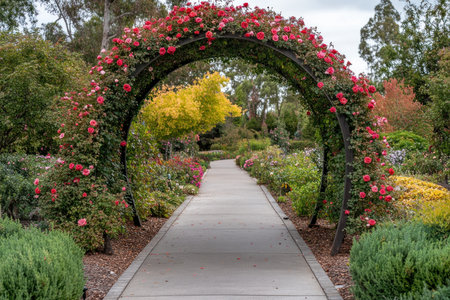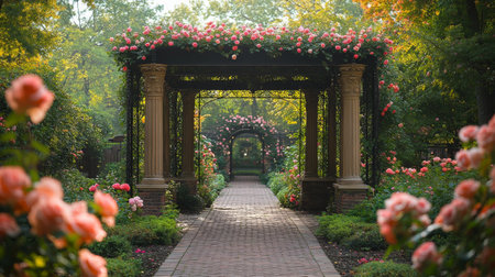 A picturesque garden arch adorned with climbing roses, inviting serenity