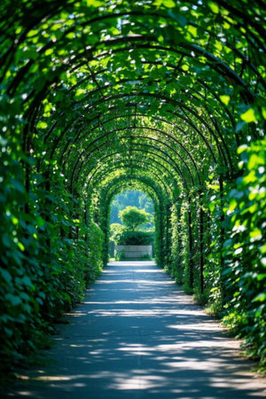 Green vine covered pergola leading path, landscape photographer framing shot, wet stone walkway, dappled light through canopy,