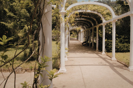 A tranquil garden pathway lined with white columns and covered by an arched trellis adorned with lush greenery. The path leads into a serene, verdant landscape.