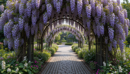 A tranquil garden pathway is lined with stunning wisteria blossoms, inviting visitors to explore the lush surroundings.