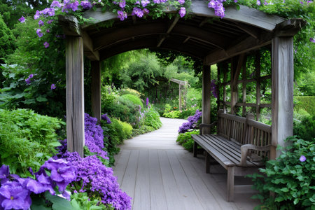 Beautiful purple flowers covering a pergola with a wooden bench on a walkway in a peaceful garden