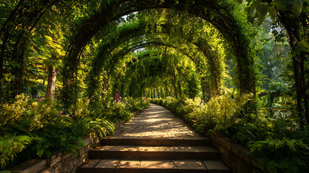 Breathtaking view of a stone pathway ascending through a lush green tunnel of foliage. Sunlight filters through leaves, illuminating the path and highlighting surrounding plants and flowers.