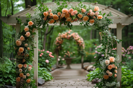 Wooden arbor entwined with peach roses and greenery for wedding ceremony in garden