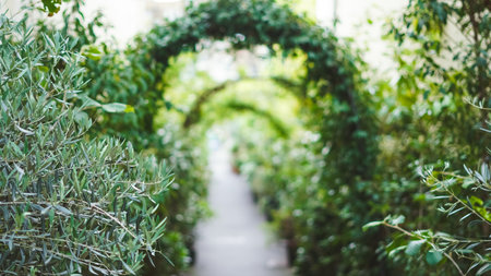 Botanical arch with lush greenery adds charm to cafe patio garden seating.