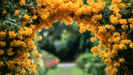 A stunning arch of vibrant yellow bougainvillea flowers frames a peaceful garden pathway, inviting tranquility and beauty in a serene outdoor setting.