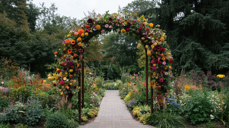Experience the beauty of a serene garden featuring a vibrant floral archway and a charming pathway adorned with colorful blooms and lush greenery.