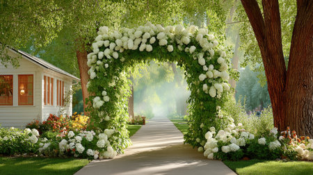 A grand floral arbor overflowing with white hydrangeas and trailing ivy, golden hour light filtering through, creating a heavenly glow for a perfect wedding moment