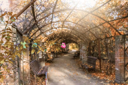 Gazebo entwined with a vine in the autumn park. Pink flower. Bench for rest.