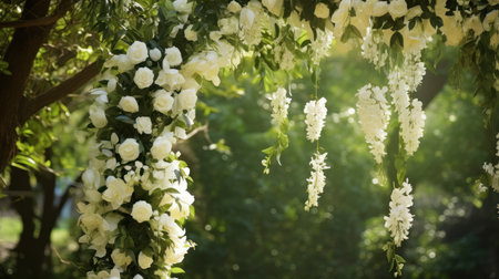 White jasmine flowers garland among the trees Elegant decorations for large weddings