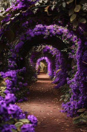 Enchanting Garden Path surrounded by Vibrant Purple Flowers and an Elegant Archway