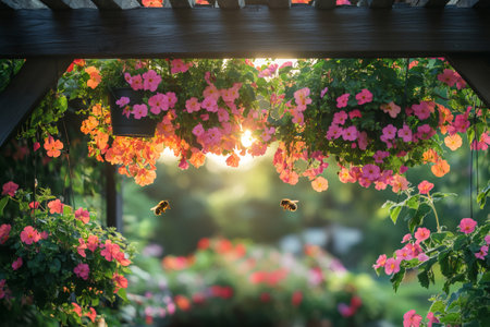 Two bees flying towards hanging flower pots during a golden hour sunset in a beautiful garden