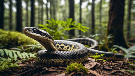 The viper yellow eye focuses on prey in the forest generated by artificial intelligence