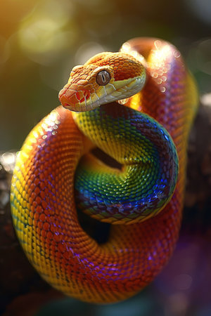 A vividly colored snake coils around a branch, showcasing bright scales under sunlight filtering through leaves in a lush rainforest. Its scales shimmer with a palette of red, yellow, and green..