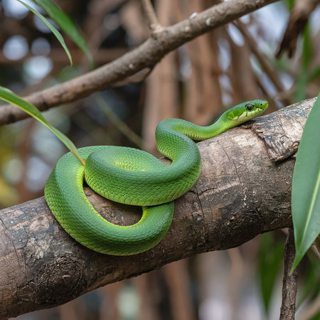 a green snake perched on a branch in the forest, cobra.