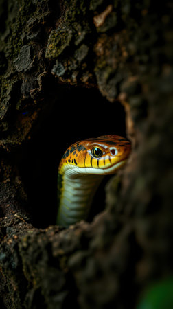 Snake peeking from a tree hollow in a lush forest during daylight hours