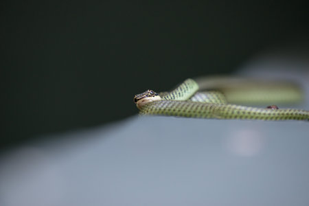 macro image of golden tree snake or Chrysopelea ornata viewed head on with blurry background
