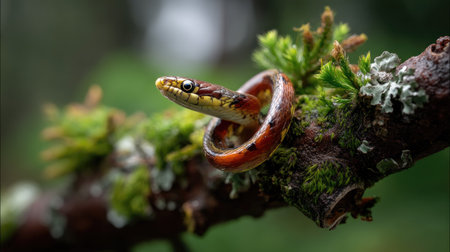 A vibrant snake perches on a moss-covered branch in a serene forest environment. The intricate scale patterns and vivid colors stand out against the lush greenery, creating a captivating natural scene. Perfect for wildlife enthusiasts and nature lovers.