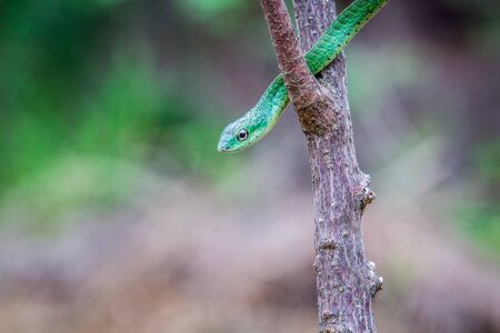 Green snake on a tree branch in the rainforest, Thailand.