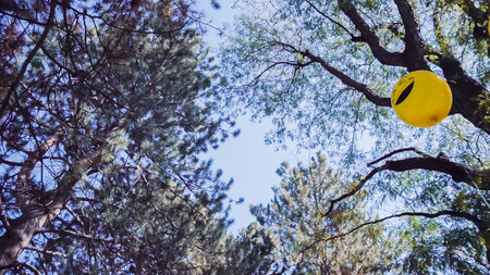 Yellow emoji balloons at little boy birthday party in the park.