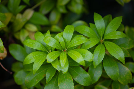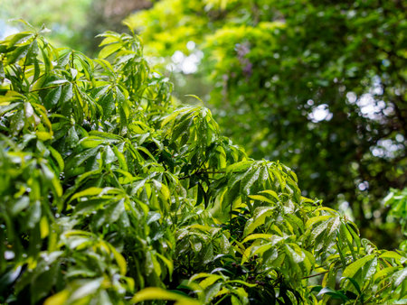 Schefflera arboricola or dwarf umbrella tree evergreen shrub plant. Green leaves with leaflets.