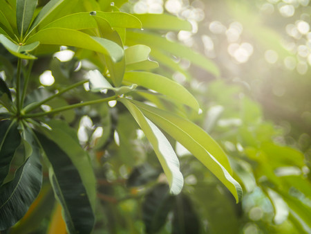 Selective focus closed up tropical summer green leaf background with sunlight.
