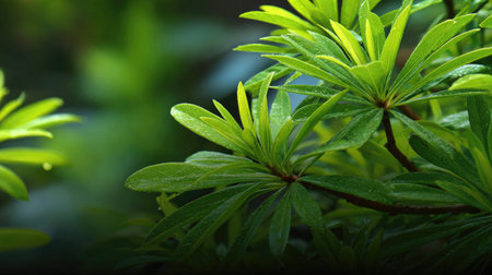 Lush and vibrant green leaves adorned with raindrops glistening in the sunlight