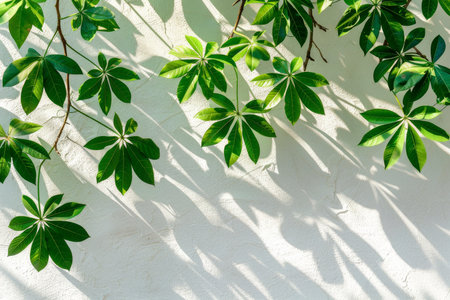 Green Tropical Schefflera Arboricola Plant Leaves with Shade on White Concrete Wall Background