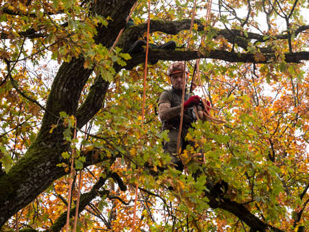 MUNICH, GERMANY - OCTOBER 21, 2017: A tree climber secured with a rope is cutting branches of a big tree